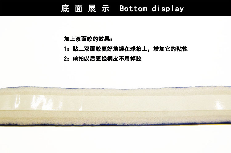 使用注意:柄皮有兩面,貼了雙面膠的是背面,纏時要把背面的雙面膠離型紙撕掉,再纏在球拍上,后用封口條固定好。另外,柄皮是消耗品,表面磨破后需要及時更換手膠。